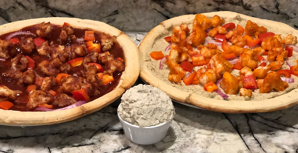 I use the bell pepper, onion, and cauliflower wings but this is totally customizable. Bake according to pizza crust instructions. Enjoy:)